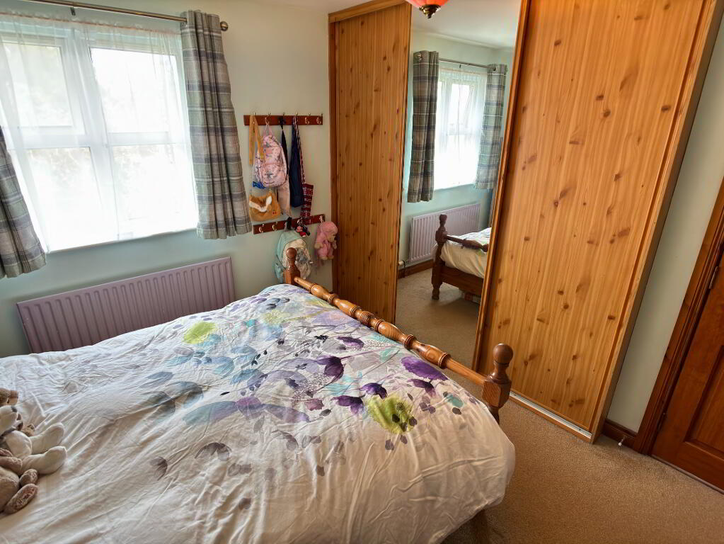 Rear aspect double bedroom with fitted sliderobes, single panel radiator and carpet flooring.