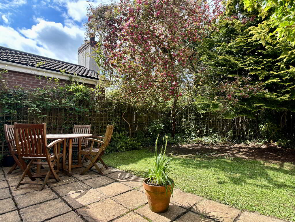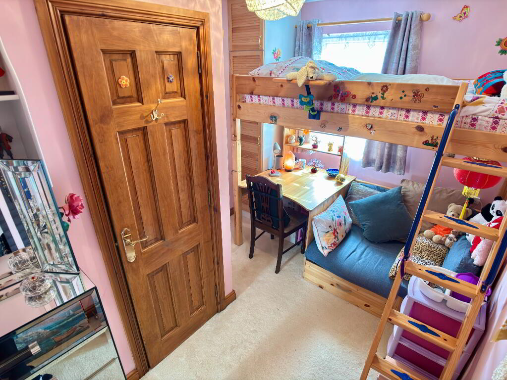Front garden laid in lawn with spacious tarmac driveway for numerous vehicles. Access gate to rear garden. Fully enclosed rear garden laid in lawn with mature trees and shrubs and paved patio area surrounded by timber fencing. Chalet summer house 10' x 8' with light and power. Water tap.