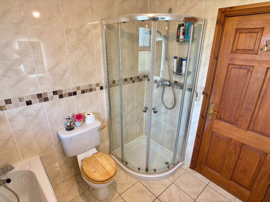 Four piece white suite comprising tile fronted bath with shower attachment. Corner shower cubicle with mains fitment and glazed sliding panels. Pedestal wash hand basin and wc. Tiled walls and tiled flooring, chrome towel rail, led wall mirror, venetian blinds and extractor fan.