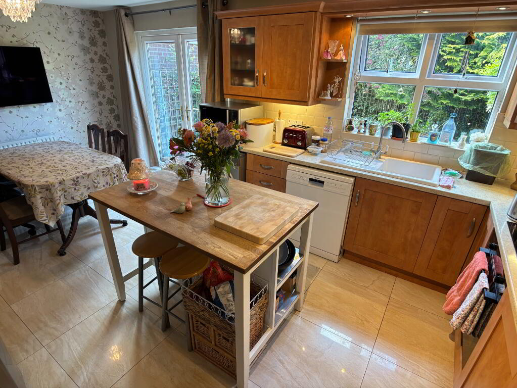 Open plan kitchen/dining area with an excellent range of high and low level cupboards and drawers, Carron Phoenix ceramic sink and drainer, Bosch integrated cooker and Neff induction hob with pull out extractor fan above. Space for fridge/freezer, washing machine and dishwasher. Pelmet lighting, part tiled walls, Italian porcelain tiled flooring, double panel radiator and roller blind. Space for table and chairs, part glazed door with venetian blind to side of property. Patio doors leading to rear of property.