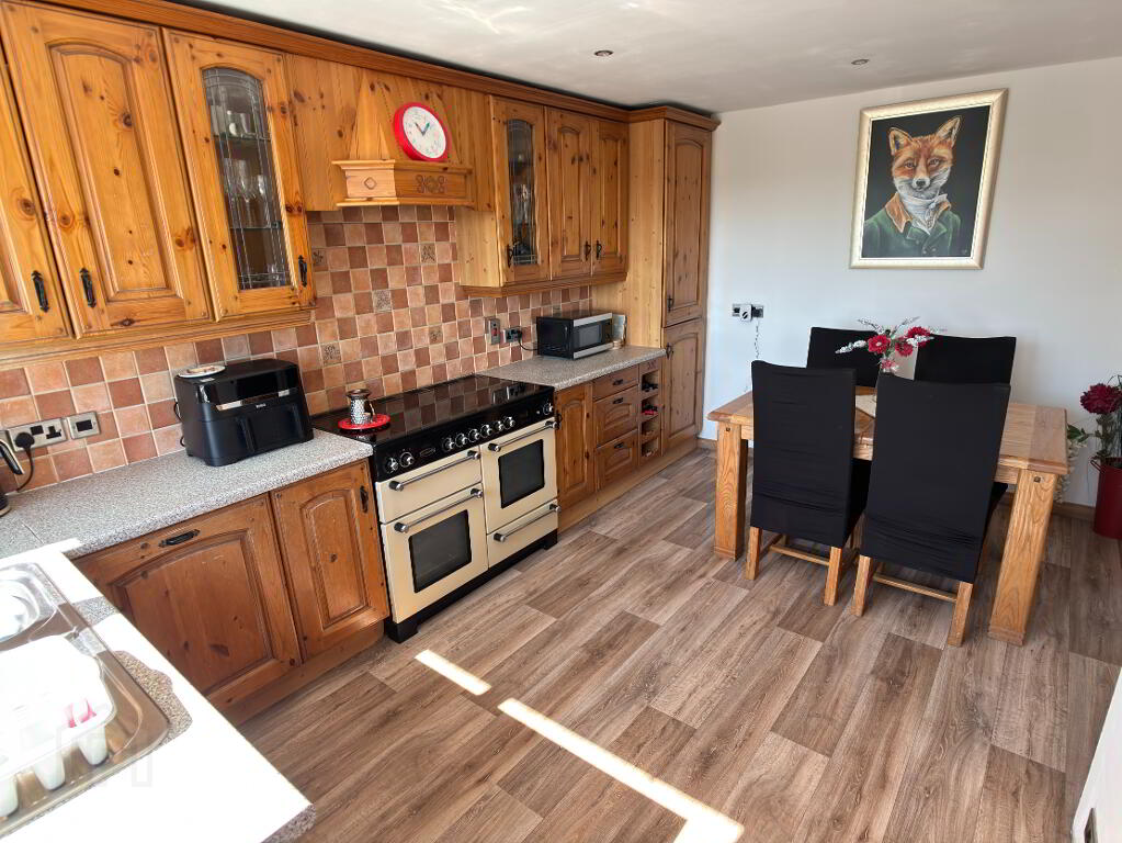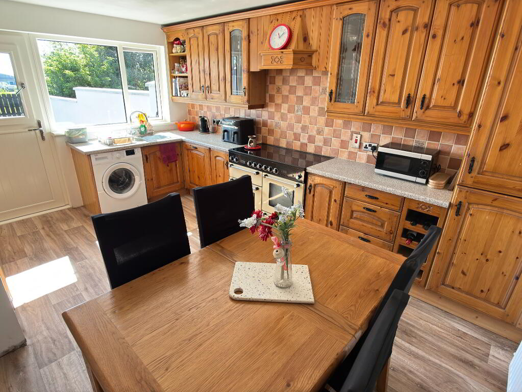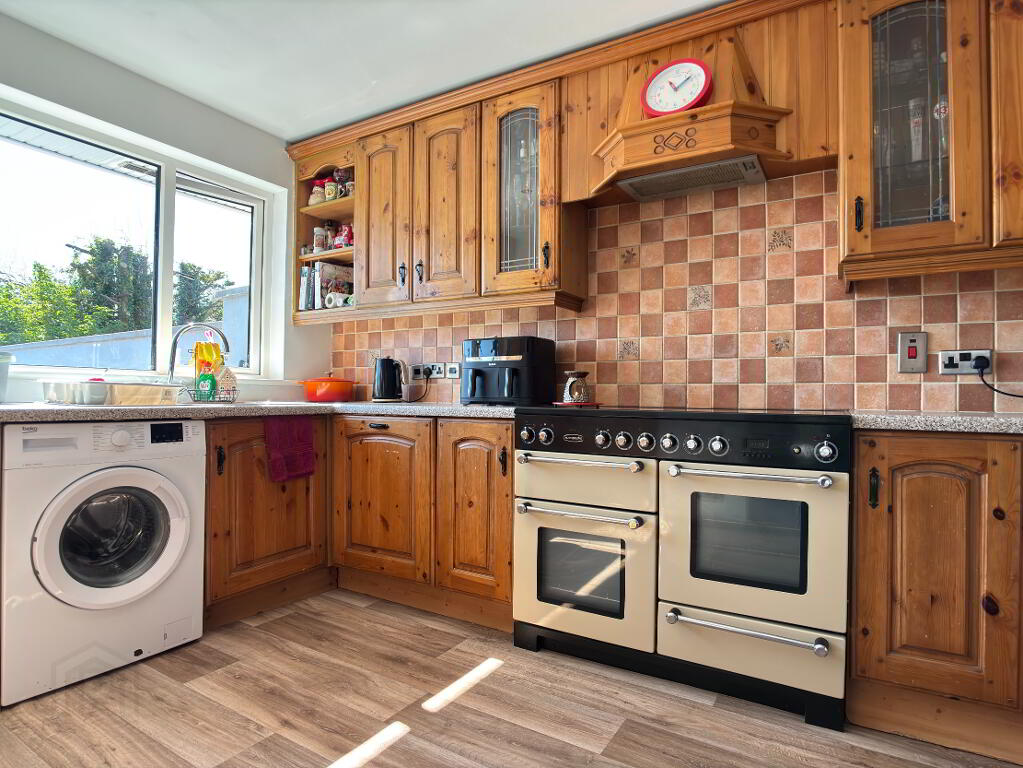 An excellent range of high and low level cupboards and drawers, 1.5 stainless steel sink bowls and drainer, Rangemaster cooker with extractor fan above, integrated dishwasher, space for washing machine, wine rack and enclosed storage cupboard. Double panel radiator, part tiled walls, recessed downlighters and vinyl flooring. Part glazed composite stable door leading to rear garden.