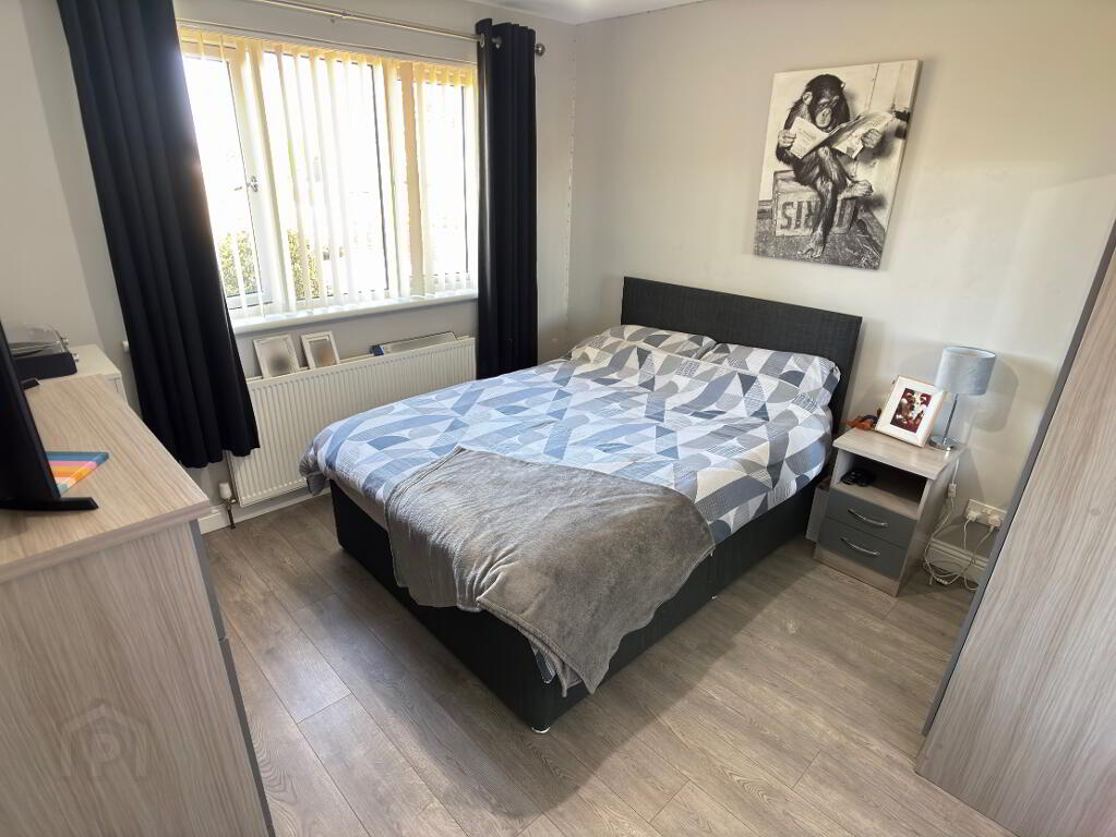 Front aspect ground floor double bedroom, double panel radiator, vertical blinds and laminate flooring.