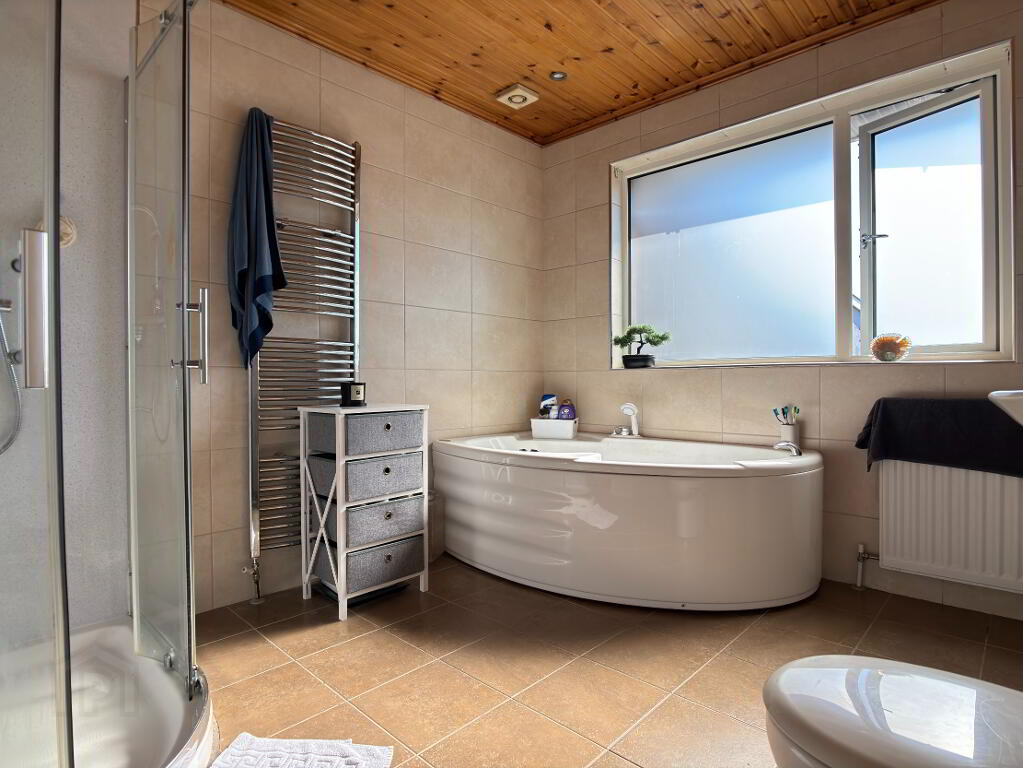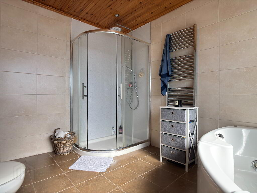 Four piece white suite comprising corner panelled bath with shower head fitment, corner shower with mains shower fitment, glazed sliding panels and pvc panelling, pedestal wash hand basin and wc. Single panel radiator and chrome towel radiator, extractor fan, tiled walls and flooring and pine tongue and groove ceiling.