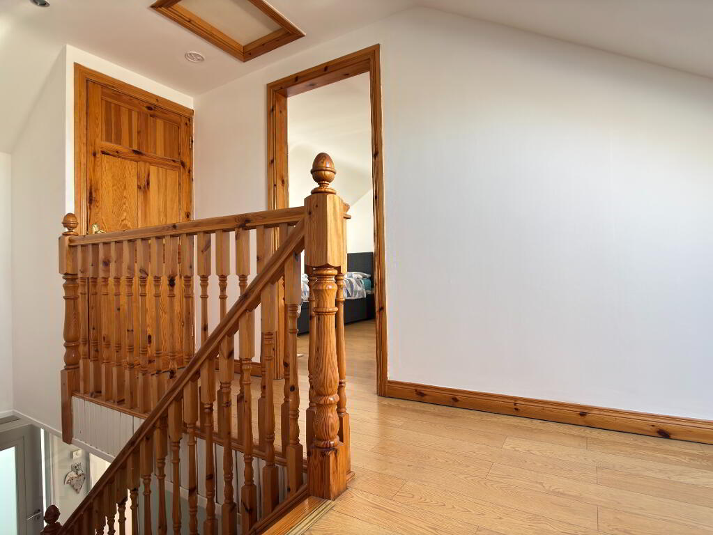 Pine spindle staircase leading to landing, enclosed storage cupboard, velux window, double panel radiator, recessed downlighters and laminate flooring. Access to roofspace.