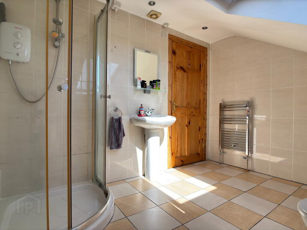 Three piece white suite comprising corner shower with Mira electric shower and glazed sliding panels, pedestal wash hand basin and wc. Chrome towel radiator, velux window, recessed downlighting, extractor fan and tiled walls and flooring.