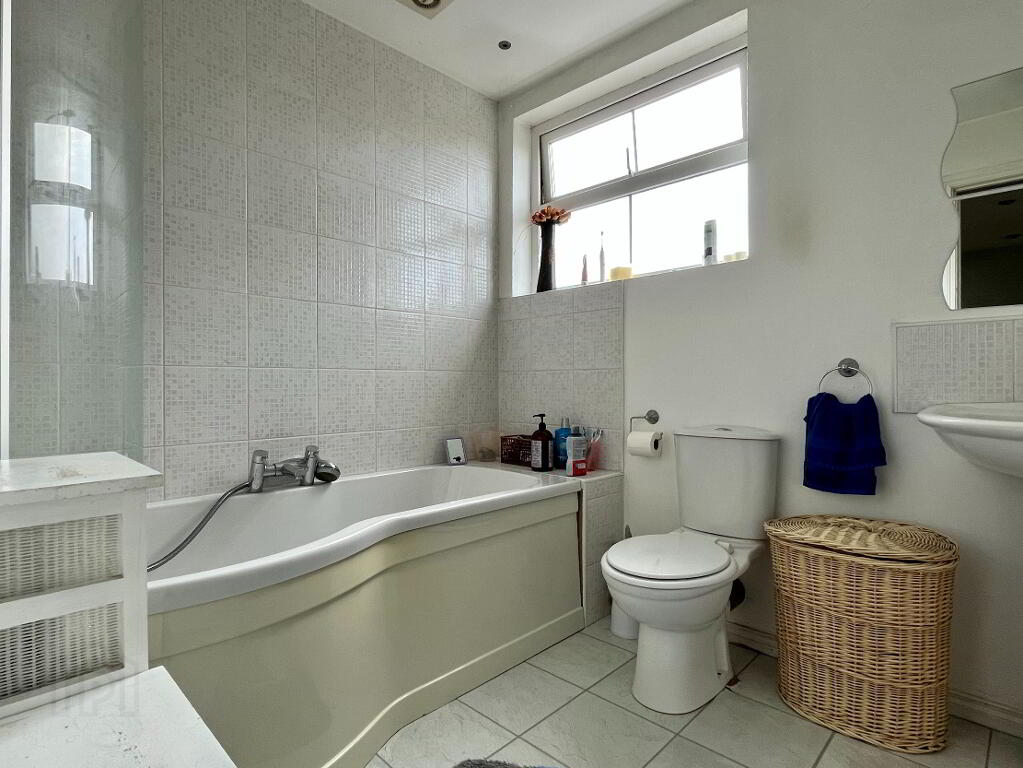 Three piece white suite comprising panelled bath with mains shower fitment and swivel glazed panel, pedestal wash hand basin and WC. Ceramic tile splashback at bath and wash hand basin. Single panel radiator, extractor fan and ceramic tile flooring.