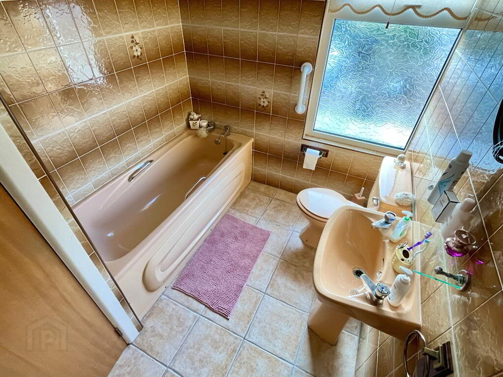 Three piece coloured suite comprising panelled bath, pedestal wash hand basin and WC. Enclosed shelved hotpress, single panel radiator and tiled walls and flooring.